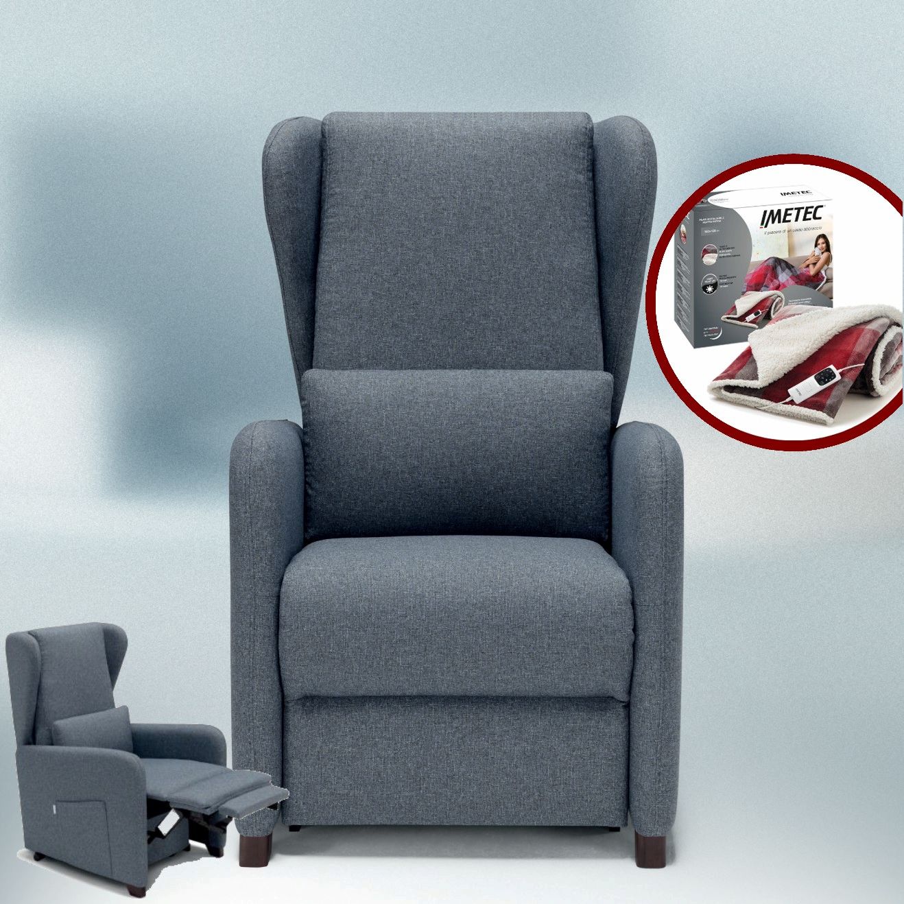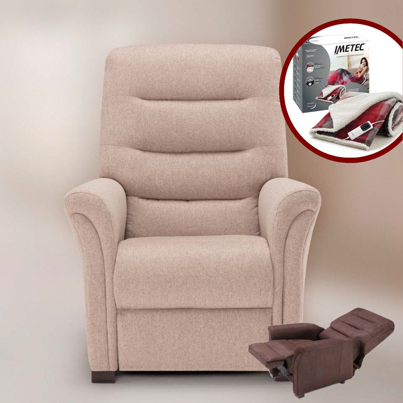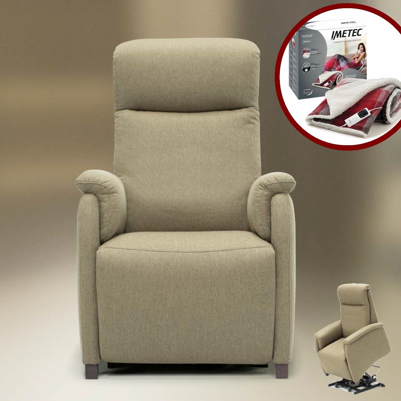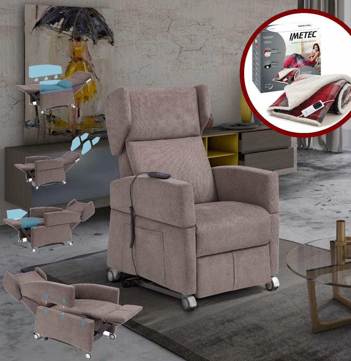 Tra i nostri modelli, troverete poltrone con funzioni di massaggio, alzapersona, reclinazione elettrica e poggiapiedi integrato, tutte pensate per adattarsi alle vostre esigenze e facilitare la vostra vita quotidiana.